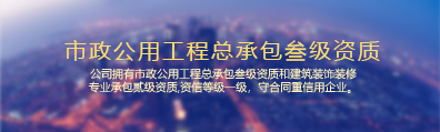 | 服務項目:建筑工程 市政工程 鋼結構工程 照明工程 園林綠化工程 土石方工程 機電設備安裝工程 建筑智能化工程 污水處理工程 裝飾裝修工程 |